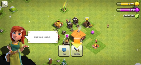 玩家一开始会获得一座“建筑工人小屋”及各一座等级1的“大本营”、“金矿”、“兵营”以及各750点的“圣水”和“黄金”,第一次进入游戏会进入引导模式让玩家了解此游戏的建造、升级、提速及解锁的方式。