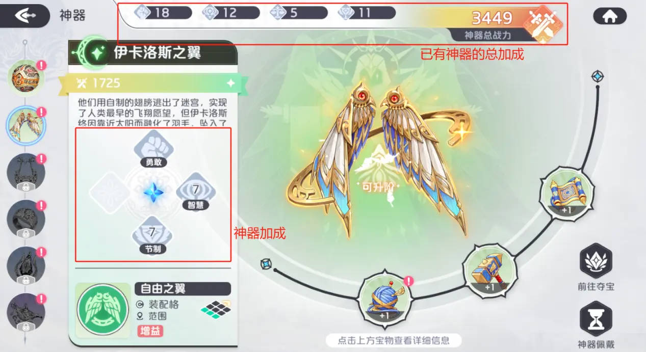 神器能整合套件中所有宝物的主角能力值强化,并直观的提供战力数值加成。且解锁的神器均能同时为主角能力值产生加成,解锁的神器越多,神器带来的总战力加成越强。