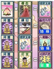 2、问道+打坐=吐纳天地(回复),问道+乱棍破法=如意自在定乾坤(高伤),横扫+横扫=乱棒破法,其他合成公式如图所示。