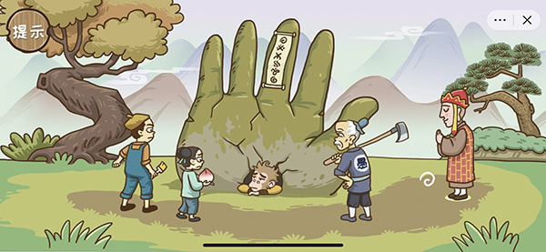 通关技巧:首先点击左上角的树枝会出现一只蝉,然后将左边第一个人手中的油漆拖动到蝉的身上变成金蝉,最后将金蝉拖动到右边和尚的头上即可召唤唐僧,解救成功。