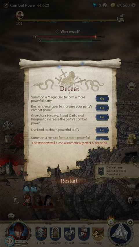 2、战斗失败后,玩家可通过强化君主和英雄重新挑战。