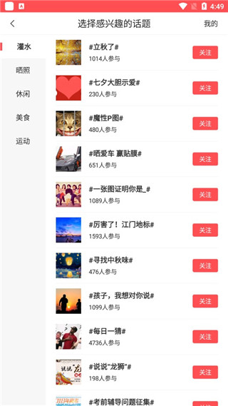2、还为你提供了休闲、美食、运动等服务板块,你可以随时参与话题;
