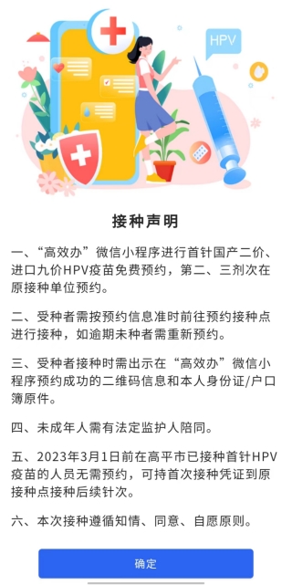 3、弹出HPV疫苗接种声明,大家需要仔细阅读,后面有接种疫苗的详细注意事项,完成后点击“确定”。