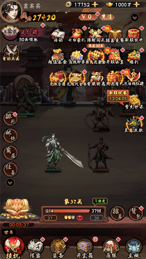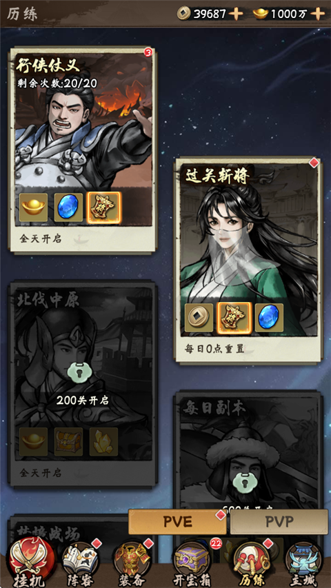 2、游戏拥有行侠仗义、过关斩将、北伐中原等PVE玩法以及竞技场、宝物抢夺、抢着争夺战等PVP玩法。