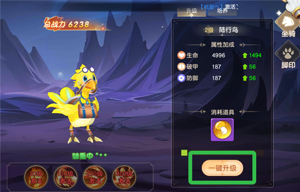 3、给坐骑升级能够提升坐骑的生命、破甲、防御等属性。