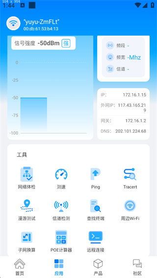 2、应用工具:网络体检帮助您发现网络问题。并包括测速;漫游测试;Ping;Tracert;信道检测等丰富的网络工具。