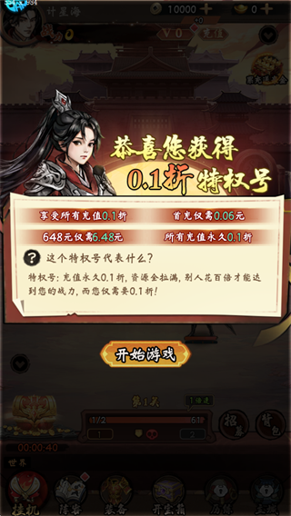1、打开游戏会获得0.1折特权号点击开始游戏