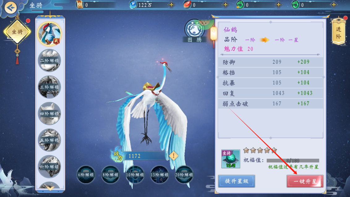 3、可以通过一键升星功能,轻松提升坐骑的实力