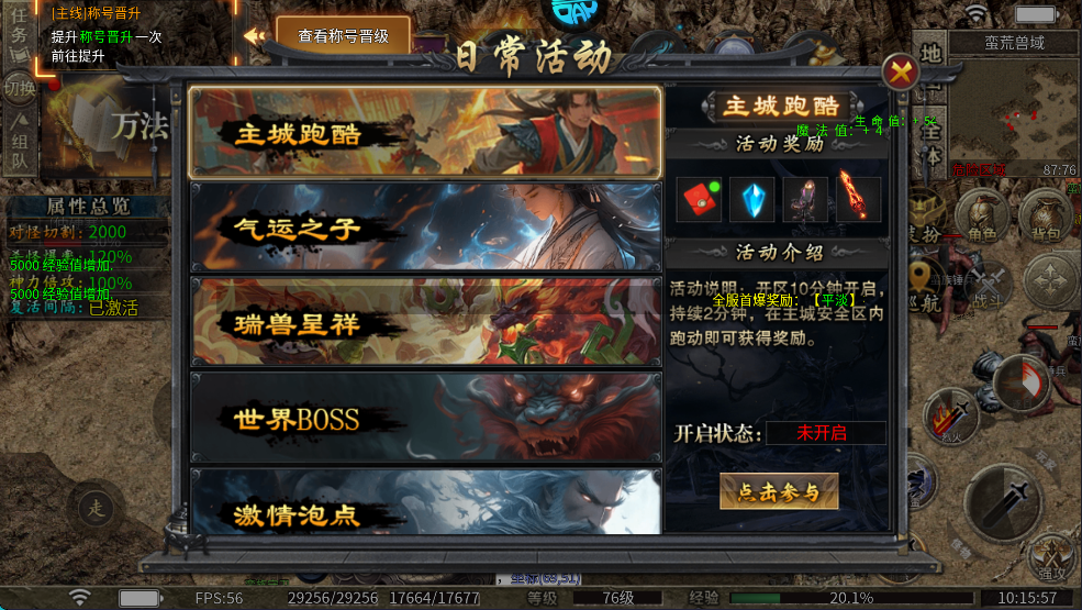 新手的话,上线跟着主线任务走就行,还能免费领取赞助和首充奖励。前期重点提升切割属性和爆率,这样打怪效率更高。游戏里活动特别多,玩法也很丰富,比如主城跑酷、气运之子、瑞兽呈祥这些,听起来都很有趣。