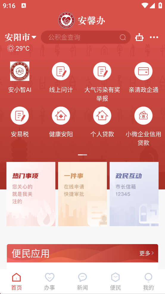 安馨办app是安阳市行政便民服务中心为企业和群众提供的一款政务和便民服务的移动端应用,办事人通过身份验证登陆后,即可一站式办理公安、住建、司法、税务、医保、人社、民政、水、电、气、暖等多个部门的多项业务,无需再为办事去线下奔波,帮助用户节省大量精力和时间,有需要的朋友欢迎下载体验!