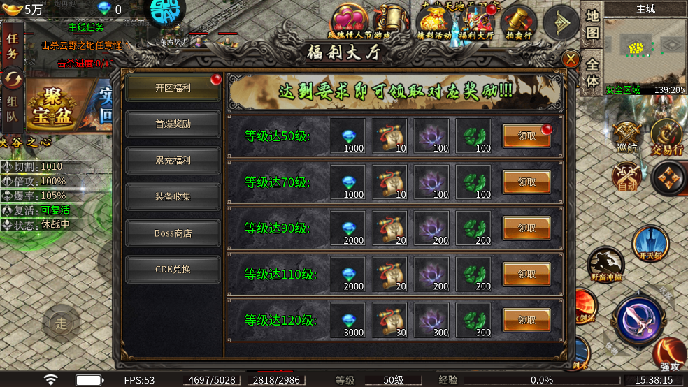 然后进入福利大厅,点击开区福利,达到一定等级可以领取海量奖励