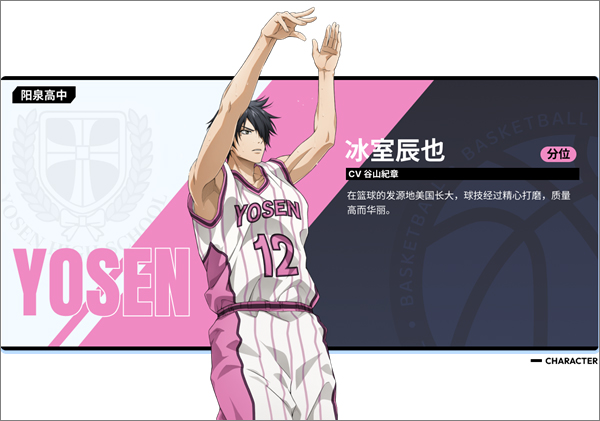 海常高中的首发球员。在个性派聚集的海常里虽没有出彩表现,但凭借稳健的防守能力守住了篮板。