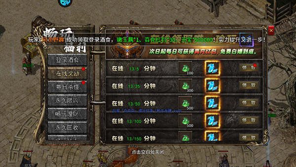 3、每天登陆在线30分钟,领取神奇酒食以及大量充值卡