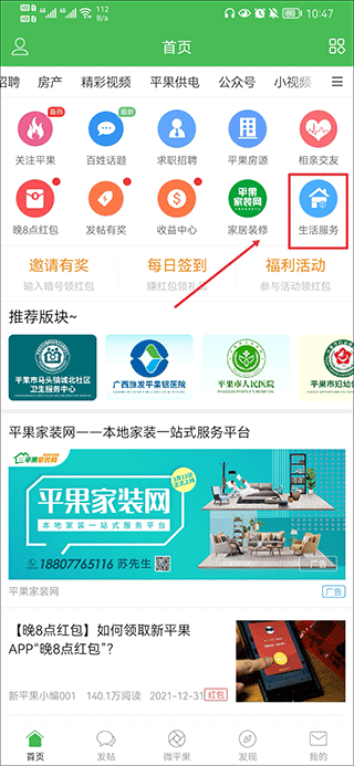 1、打开新平果网app,在首页中点击生活服务