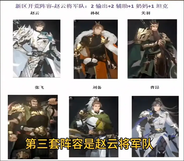 -刘备、孙权、曹昂:均转职【将军】,通过邀战触发赵云多次攻击。孙权每2回合可为全队拉条提升攻击频率,曹昂每2回合可为全队增伤,增强队伍的输出能力。
