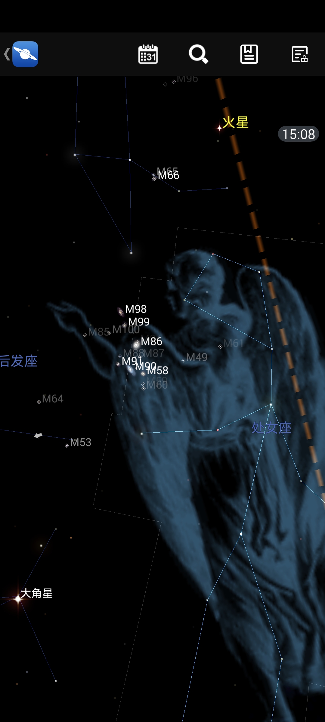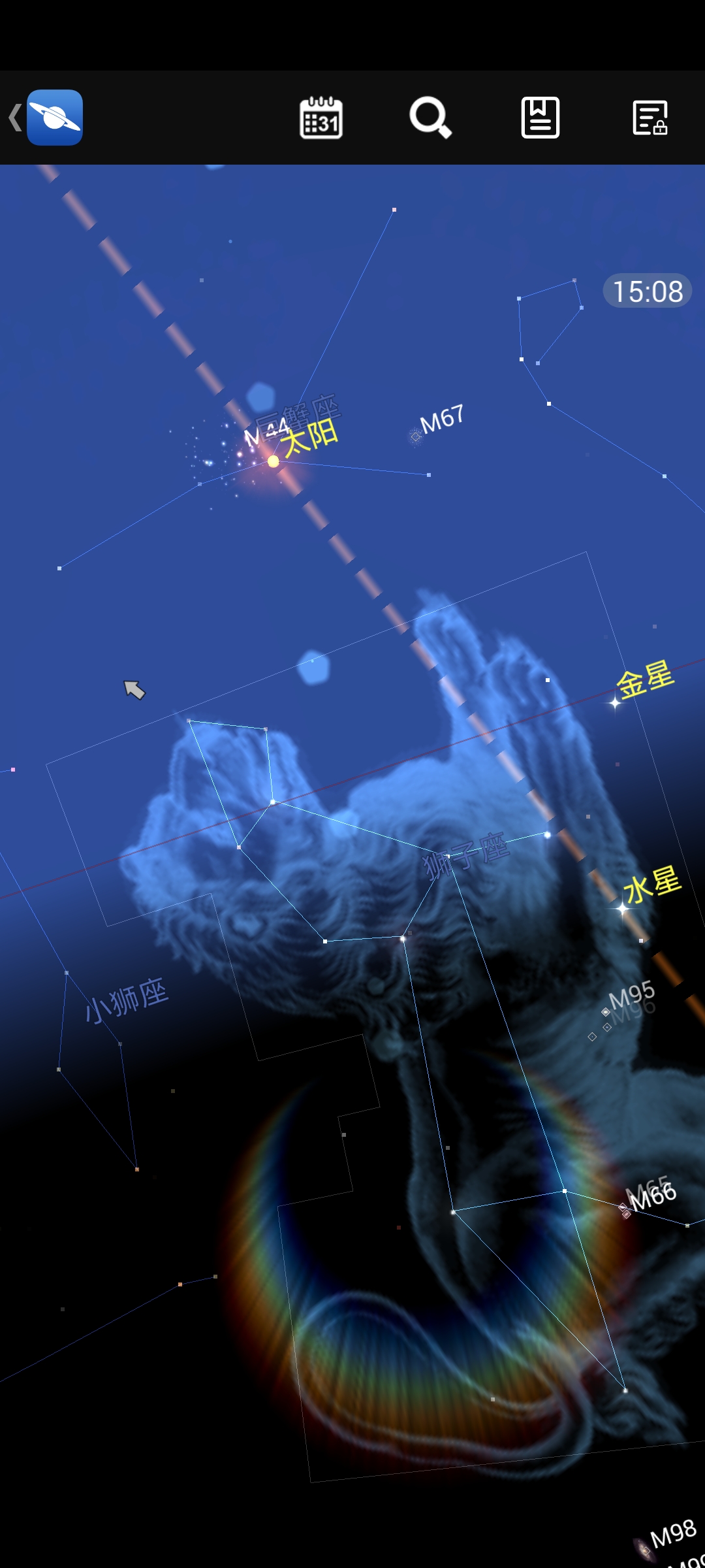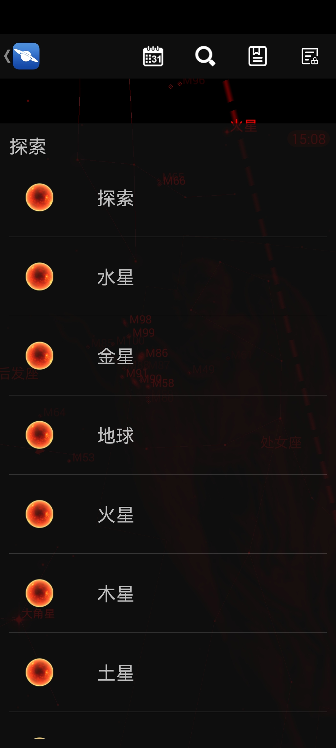 4、点击左上角的图标,可以查看夜空天體,比如说太阳系、恒星、星座、梅西耶天体;还可以设置模式;