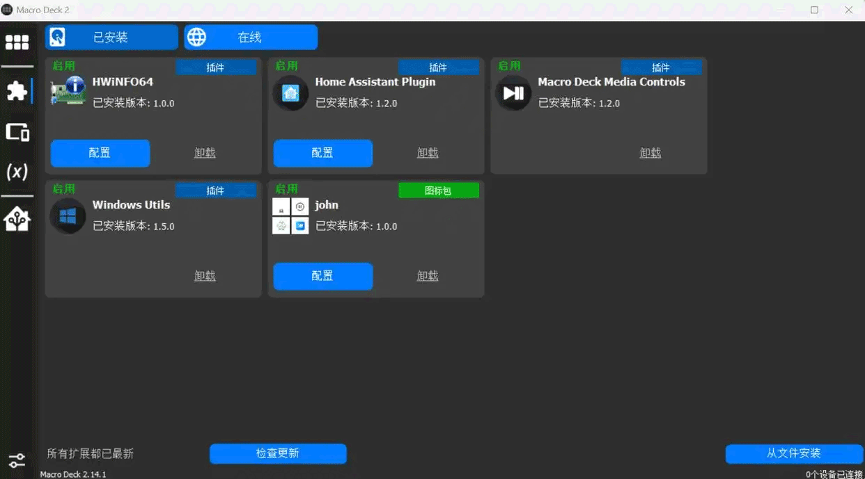 内置包管理器可一键安装官方/社区插件(如Discord状态控制、Twitch弹幕互动、硬件监控仪表盘),覆盖流媒体、办公、IoT等全场景需求。