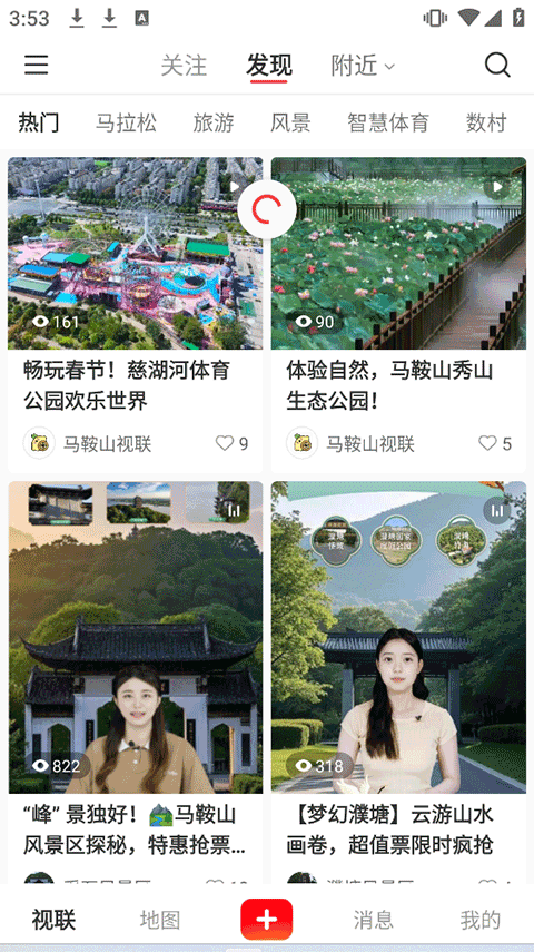 1、app有五个版块组成,首页视联界面可以看到全国各地的旅游景区,或者是赛事活动、特色村庄等