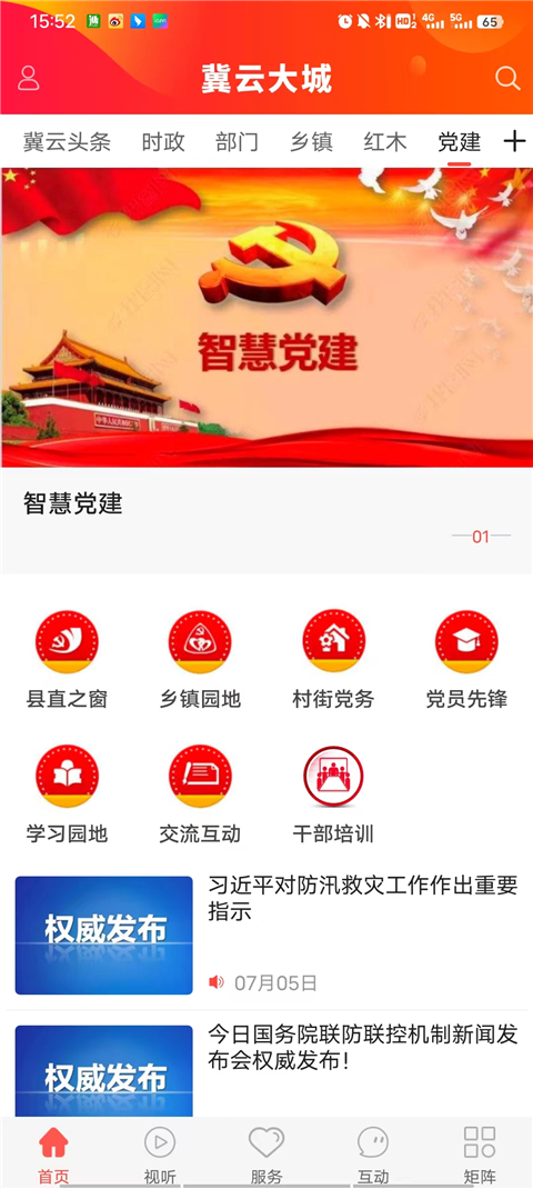 1、进入软件之后,点击首页,它为用户提供了时政、部门、乡镇、党建等等最新资讯;