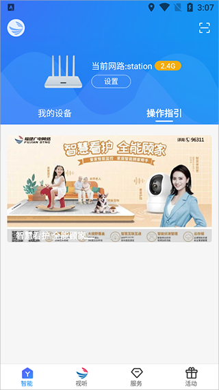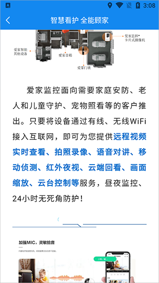 用户首先可以在应用中的操作指引页面中点击爱家监控摄像头宣传图像