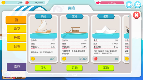 4、捕获的鱼可以到鱼店售卖,以此获得金币;
