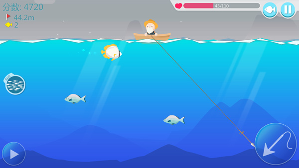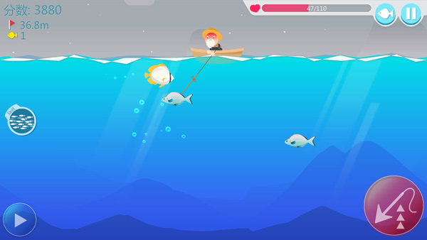 捕鱼大冒险汉化版是一款全新的模拟捕鱼手游,玩法类似黄金矿工,玩家在游戏中需操作角色驾驶船只出海,并在合适的时机点击屏幕抛出钩子捕鱼,每捕一条鱼都会恢复一些血量,血量清空后游戏结束,捕获的鱼类越多,得分越高。同时游戏内捕获的鱼类可在鱼店进行售卖,以此获得金币,然后用来购买船、鱼叉、升级装备等,提升自己角色的捕鱼能力。