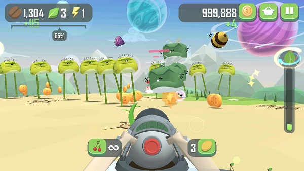 游戏的玩法很简单,按住屏幕双端移动射击保护苗子,发射的炮弹为各种水果,过程中可以吃各种技能,玩法倒是挺丰富的。多边形风格的背景美化画面的同时,使怪兽逐渐逼近的过程中显得更加紧张刺激。