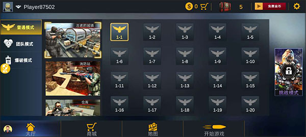 1、普通模式:即个人挑战,玩家没有队友,独自作战。关卡挑战成功的条件是进入关卡寻找敌人并使用枪械击败敌人,把所有敌人皆数射杀即可获得挑战奖励并进入下一个关卡。