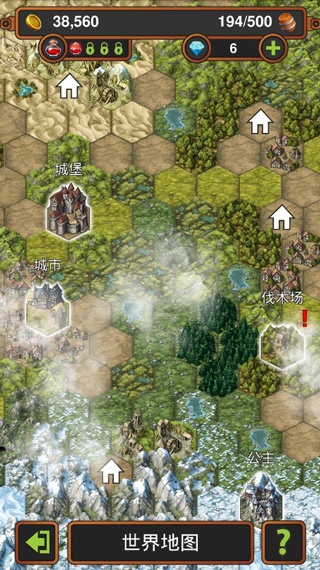 进入游戏,开始我们王国的发展之旅。在游戏的世界地图中,我们可以看到我们所拥有的所有房地产,白色房子的图标择表示可以购买新的房产,首先我们购买伐木场为我们的第一建筑。