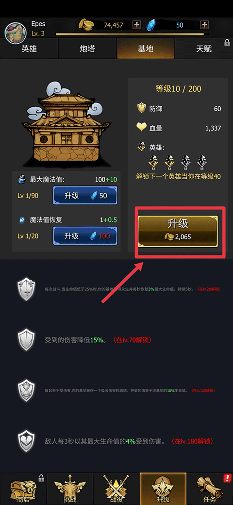 8、另外我们还可以在基地界面中为基地进行升级来提升他的防御能力等