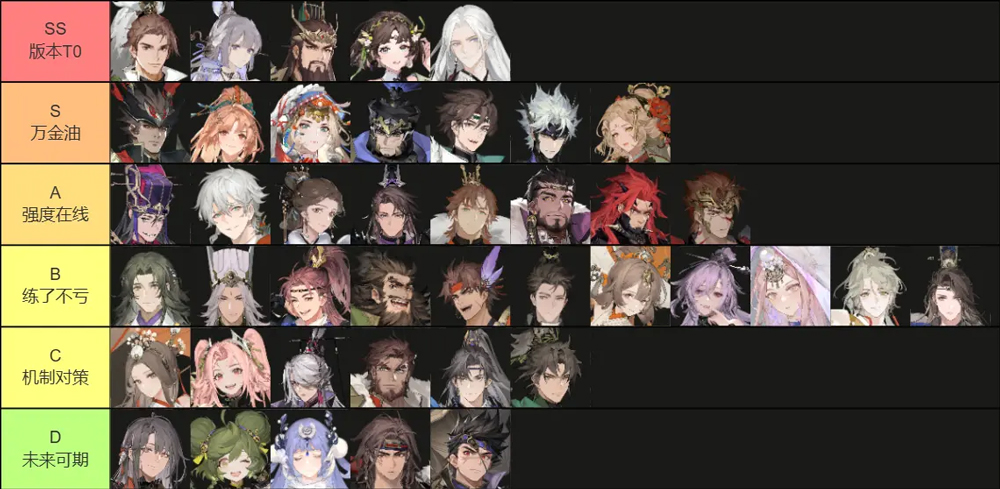 5、豪刃曹操、丹翎孙尚香、玄渊吕布、蜃梦左慈、瀚雪张辽、凛煜刘备、诳诡司马懿、重溟张飞、关银屏、明幽貂蝉、煊明孙策:这些武将都是T0级别的强力武将,各自拥有独特的技能和强大的战斗能力。