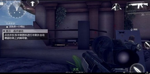 继续前进无脑干掉路上的敌人,之后会遇到敌人的重火力,跟着老大避免与其交火,图中莫名其妙的图标是可以跨越掩体的动作,按下冲刺就可以翻越面前的掩体。