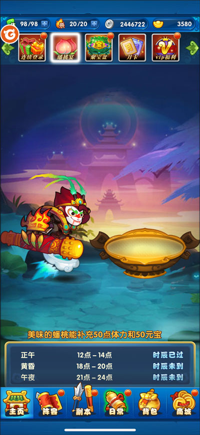 2、每天的桃子、体力丹一定要尽量吃满,不要浪费,体力决定着获得的经验。