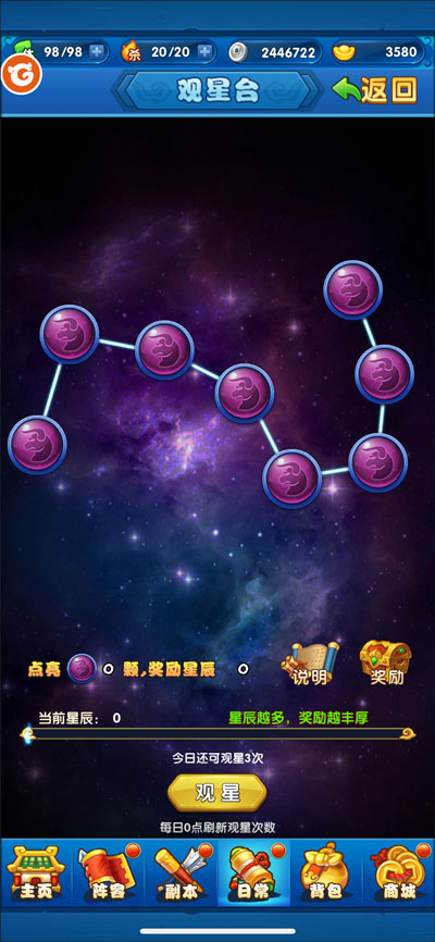 6、观星台的每日观星一定要搞,里面每天有将近100个突破丹、赵云碎片、金装碎片外加其它零零碎碎的奖励,那可是相当丰厚的。