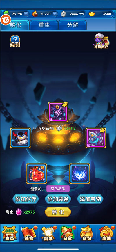 12、没事儿每天扫两眼乾坤炉,没用的伙伴碎片、装备、宝物,该分解的就麻利儿分解,伙伴魂魄分解得魂蛋、装备分解得洗炼石、宝物分解得精炼材料。所以没事儿就去溜溜,绝对没坏处。