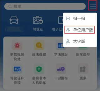 2、使用注册账号登录“交管12123”APP,在首页右上角切换至单位用户版。若使用人在多个单位有用户,需选择具体单位后进入。