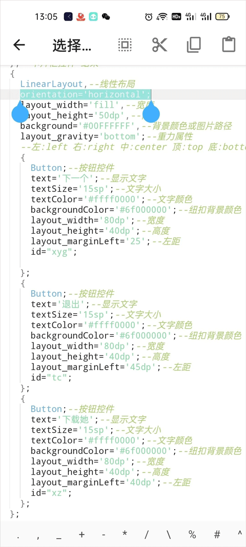 这时这三个按钮是竖向排列的!我们需要设置为横向排列,这我们需要将它们三个按钮设置在一个线性布局中,而线性布局的方向要设置为horizontal横向