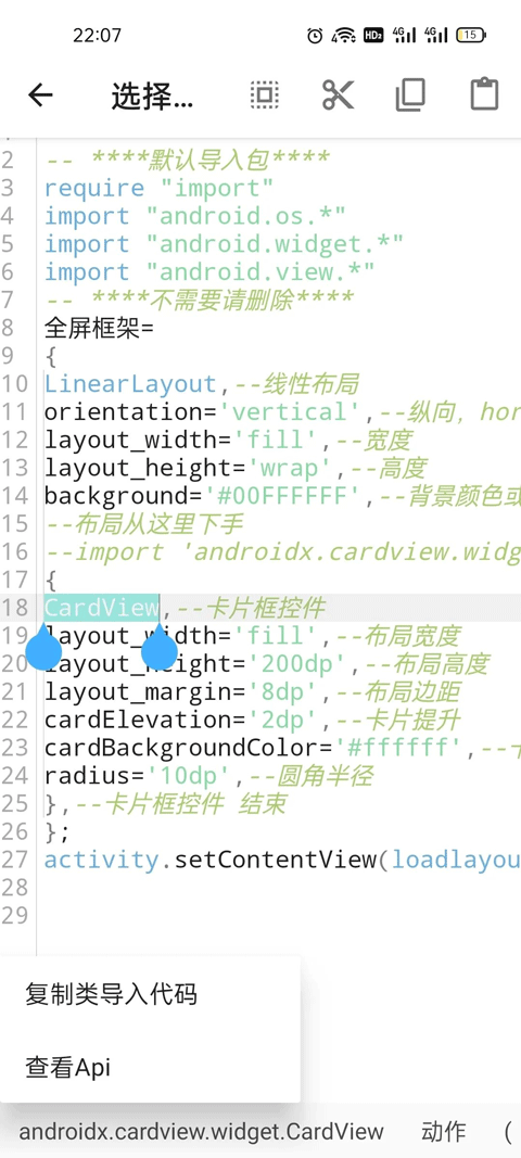 当添加某个布局控件后我们的应用可能出现bug,会提示错误信息,这时我们需要长按控件名称,等左下角出现控件API我们复制类并粘贴类名,将双引号前面的代码删除,并添加代码import