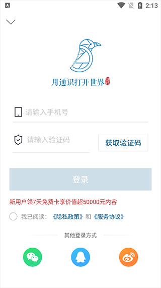 1、进入软件后,新用户需使用手机号获取验证码进行登录;