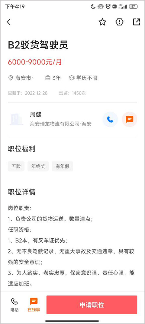 3、然后你就可以选择适合自己的工作,看到合适的你可以点击申请职位,或者直接电话联系。