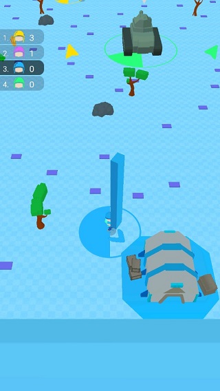 这是一款趣味性超强的休闲竞技小游戏。在游戏中,你扮演一方营地工程师(营地颜色任君选择吼),在地面趟板板的紫色砖块是材料,收集材料叠叠高到无法承受重力后,回营地建造,召集更多士兵战斗,并且不断壮大你的队伍。再不断收集弹药把中央炮车填满,中央炮车成为我们战力后,会为你赢得80%的胜率;这时,你只需要将敌人引入圈圈,剩下就是坐等王者称号的到来。
