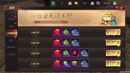 福利系统中分为七日登录、签到、冲级豪礼、祈福、奖励找回和礼包兑换。每天上线后记得点开福利系统,可以领取超值福利。礼包兑换便不在此赘述啦,大家懂得都懂!