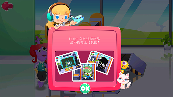 打开游戏,点击play键,美好的一天就开始啦!哇~机场里来了好多乘客啊,真是应接不暇呀!虽然我们的糖糖很乐意为他们服务,但她毕竟没有三头六臂啊,所以很是需要你这个小帮手呢。看,有乘客在等候安检,快去帮忙吧:点击安检机或乘客头上的泡泡进入小游戏,糖糖会提醒你应该检查什么,记住后点击OK键继续,然后乘客会将他的行李放到安检机上,如果红灯亮了,就表示箱子里有违禁品,看到了吗,把它们一一取出来吧,如果绿灯亮了,这表示箱子里没有违禁品哦;然后你需要检查乘客身上有没有不能带上飞机的物品,用探测仪扫描,如果红灯亮了,把他身上的电子设备等都放到左边的盘子里吧,如果绿灯亮了,乘客可以直接取行李然后离开。记得仔细检查每一位乘客哦,找出所有的违禁品,因为这对于飞行安全可是至关重要啊,不容任何闪失。