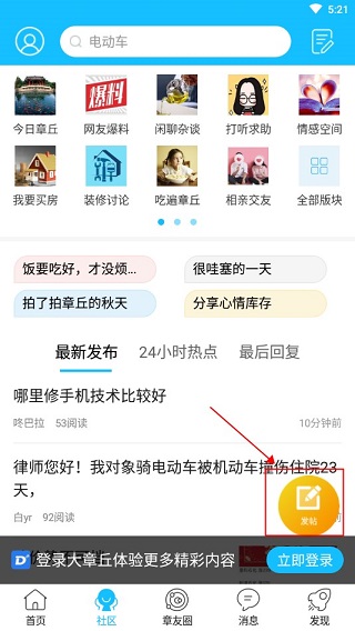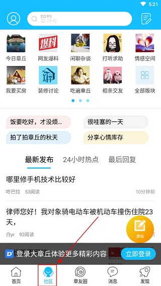 2、进入社区后,点击如图所示位置的【发帖】功能按钮,即可发帖。