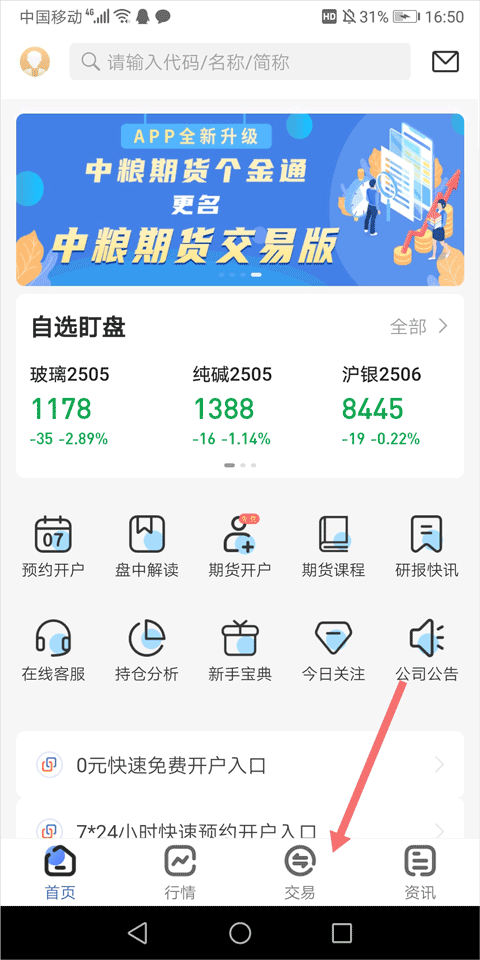 1、登录中粮期货交易版app后,点击首页底部「交易」