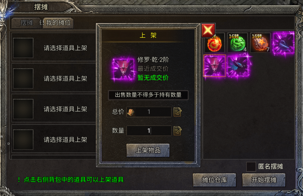 在有打到多的装备或者道具想要进行出售的话,在游戏内是有摆摊系统的,将不绑定的装备和道具可以放到摆摊系统上进行出售,摆摊数量不能超出持有数量,至于出售的灵符就得玩家们自行设置认为合适的价格进行摆摊了,也可以以上架显示的成交价设置合理的价格进行上架。
