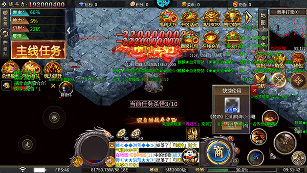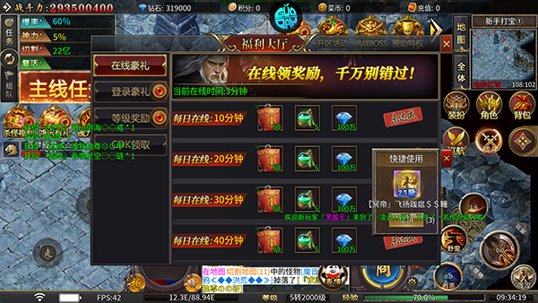 游戏中,玩家可以选择战士职业,通过完成任务和副本免费领取VIP,这对零氪玩家来说简直是福利。游戏玩法丰富,包括天赋神通、杀怪升级VIP、刀刀切割等特色玩法,还有主线任务、打怪、巡航模式等多种方式提升实力。此外,游戏内还设有自动战斗功能,极大提升了游戏效率。