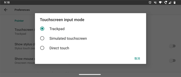 7、点选通知栏 Termux X11 的 Preferences,可从「触控模式」切换成「模拟触控板」。