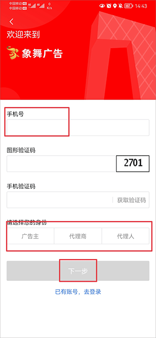 2、将手机号码、验证码,以及选择身份后点击下一步