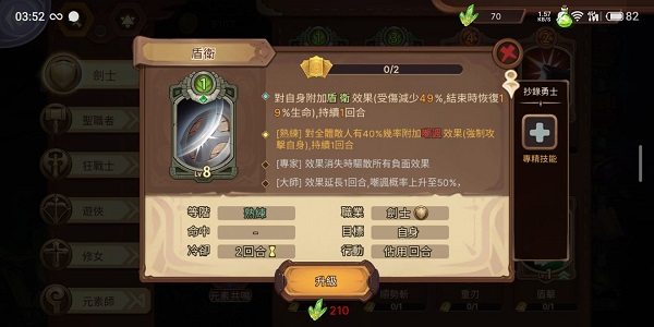 进图后第一次拿技能拿到专精概率比较大,所以建议先拿反击,之后尽量拿到盾术和饱食,盾术可以升级不耗费回合数,反击升级减费用,这样子第一回合就可以保证自己不暴毙,同时万一嘲讽到4个呢(想桃子)。保证自己烈焰盾拿到后,其他技能都是锦上添花,一轮冒险往往拿不到你想要的所有技能,先保证必备技能拿齐,那么过关就有胜算。至于boss基本就是1v1男人大战,工具人们给好buff就可以去世了,不过这里推荐一个牧师的技能。